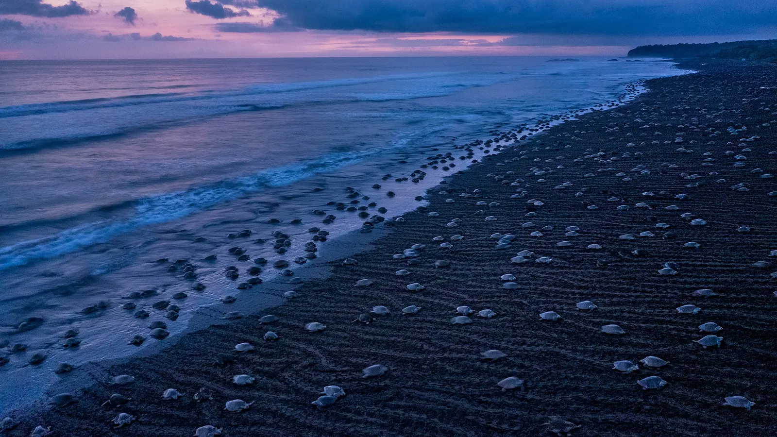 L’Arribada est un événement de ponte de masse où des milliers de femelles Tortues Olivâtres (Lepidochelys olivacea) reviennent, souvent sur quelques jours, pour pondre sur une même plage. Les scientifiques ne comprennent pas encore totalement ce qui déclenche cette synchronisation, mais le résultat est à couper le souffle : une marée de carapaces se dirigeant vers le sable.